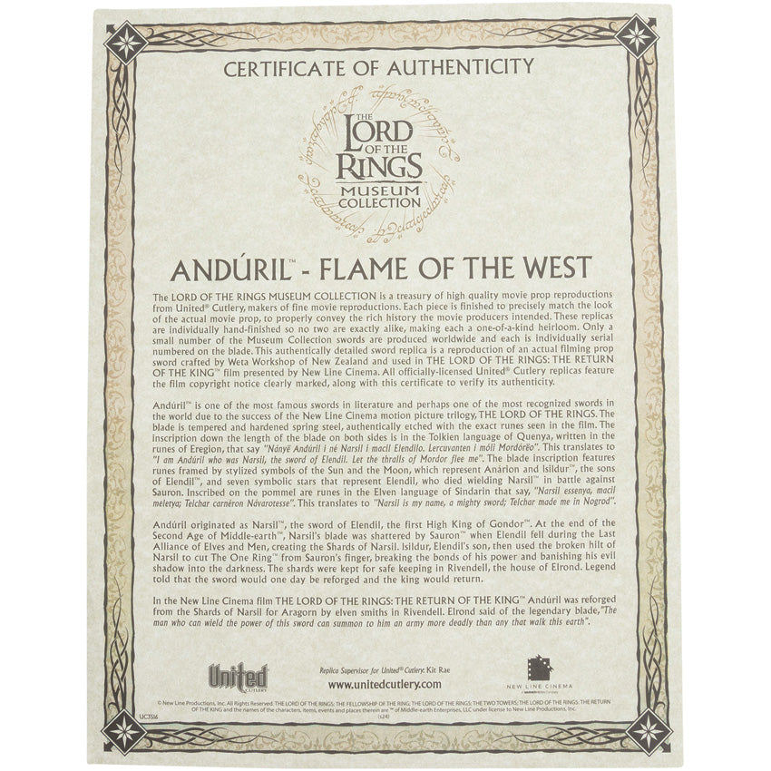 52.78" (134.06cm) overall. 40.63" (103.2cm) 1060HC steel blade. Brown leather wrapped handle. Museum Collection. Antique finish metal crossguard and pommel and 24K gold plated fittings. Serialized. Certificate of Authenticity. Includes 14.13" wooden wall display with detailed gold-plated metal crest and sword mounting arms. Also includes Gondorian themed blue cloth banner that can be hung behind display. Boxed.