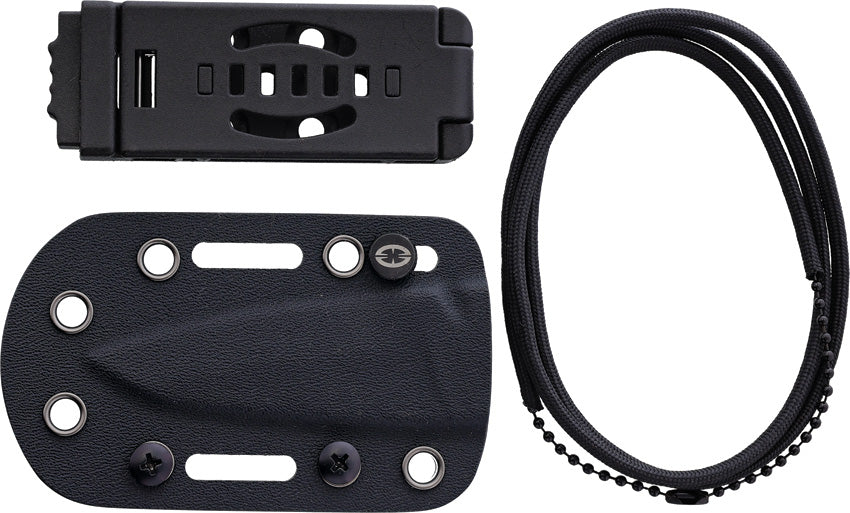 6.63" (16.84cm) overall. 2.75" (6.99cm) two-tone titanium coated VG-10 stainless blade. Skeletonized handle. One-piece construction. Lanyard hole. Black Kydex neck sheath. Boxed.