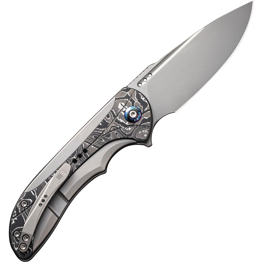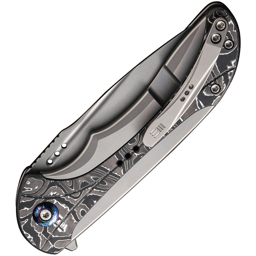 4.5" (11.43cm) closed. 3.5" (8.89cm) stonewash finish CPM-20CV stainless blade. Bead blast finish titanium handle with Aluminum foil carbon fiber inlay. Extended tang. Pocket clip. Black nylon zippered storage case. Boxed.