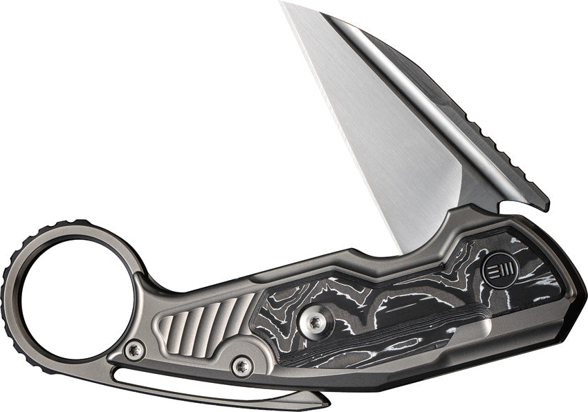 5.13"" (13.03cm) closed. 2.38"" (6.05cm) satin finish CPM-20CV stainless blade. Bead blast finish titanium handle with Aluminum foil carbon fiber inlay. Extended tang. Finger ring. Pocket clip. Black nylon zippered storage case. Boxed.