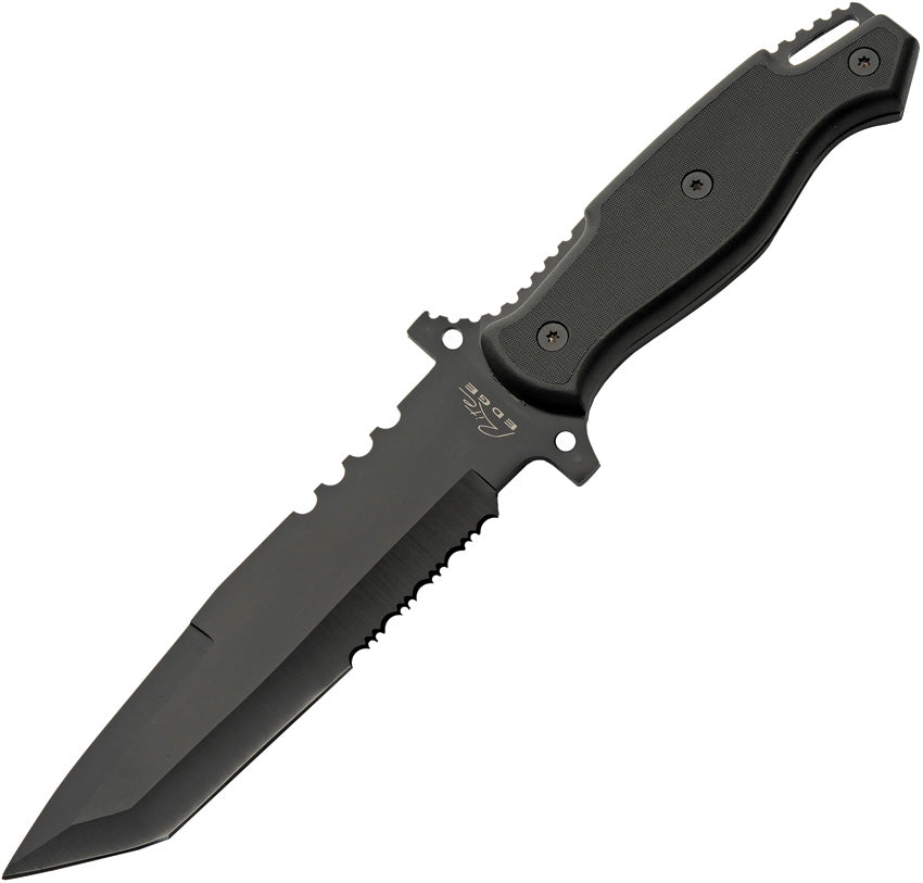 12" (30.48cm) overall. 7" (17.78cm) black finish partially serrated 3Cr13 stainless tanto blade. Black ABS handle. Full, extended tang. Lanyard hole. Black nylon belt sheath. Boxed.