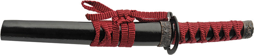 9.25" (23.5cm) overall. 4.25" (10.8cm) satin finish stainless tanto blade. Red cord wrapped handle. Wooden display stand. Black ABS scabbard. Boxed.