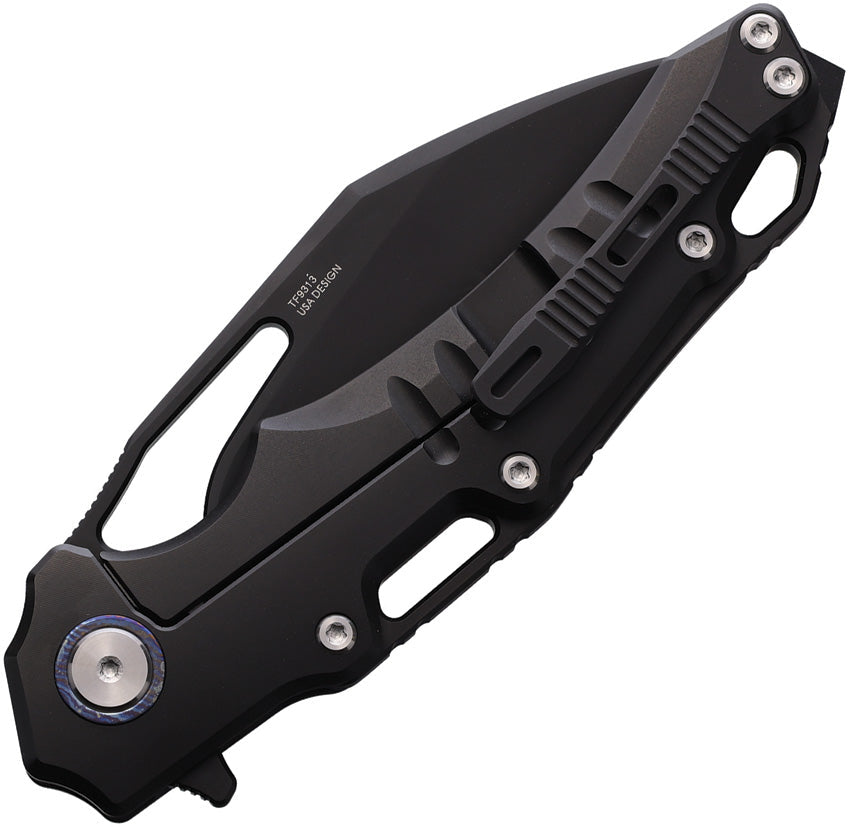 5" (12.7cm) closed. 3.5" (8.89cm) black finish Bohler M390 stainless blade. Black titanium handle with Exotic damascus steel inlay. Glass breaker. Lanyard hole. Extended tang. Thumb pull. Pocket clip. Boxed.
