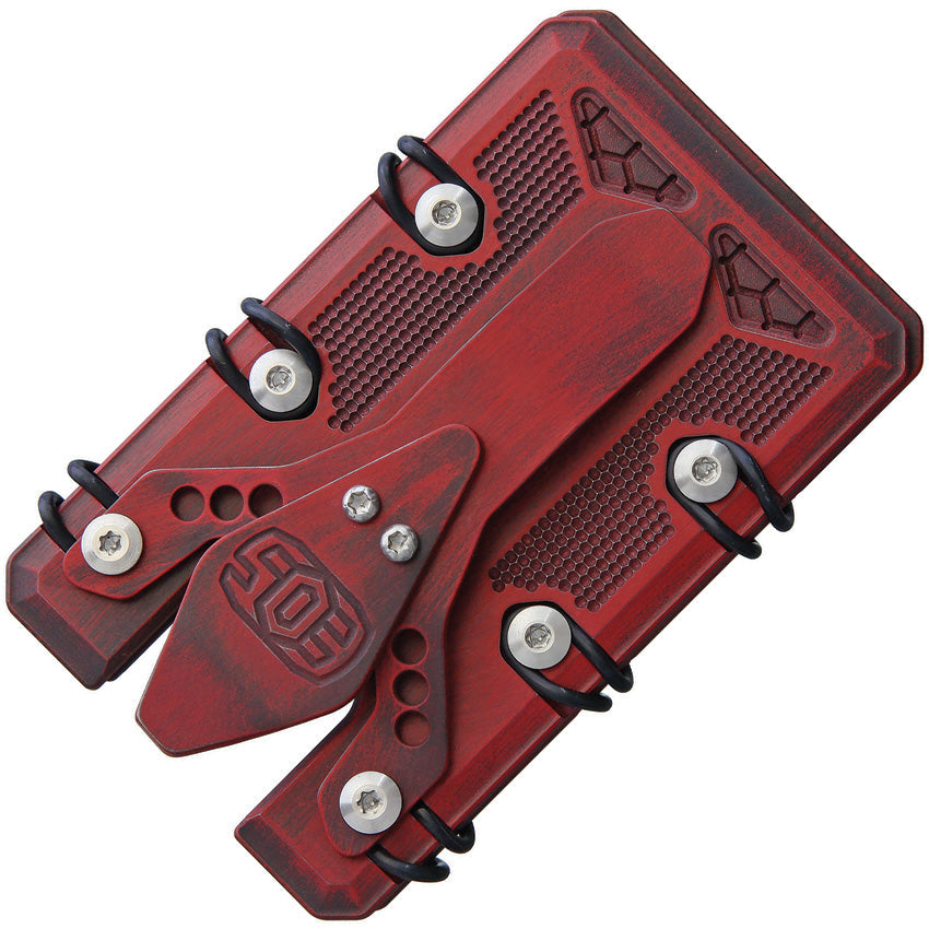 Dimensions: 3.63" x 2.25". Red and black Cerakote finish. Accommodates 25 cards or 20 cards and 20 bills, or up to 60 bills alone. The contents are accessed by using the thumb slot, which doubles as a bottle opener, to slide the contents partially out of the wallet. Includes two spare O-rings. Bulk packed.