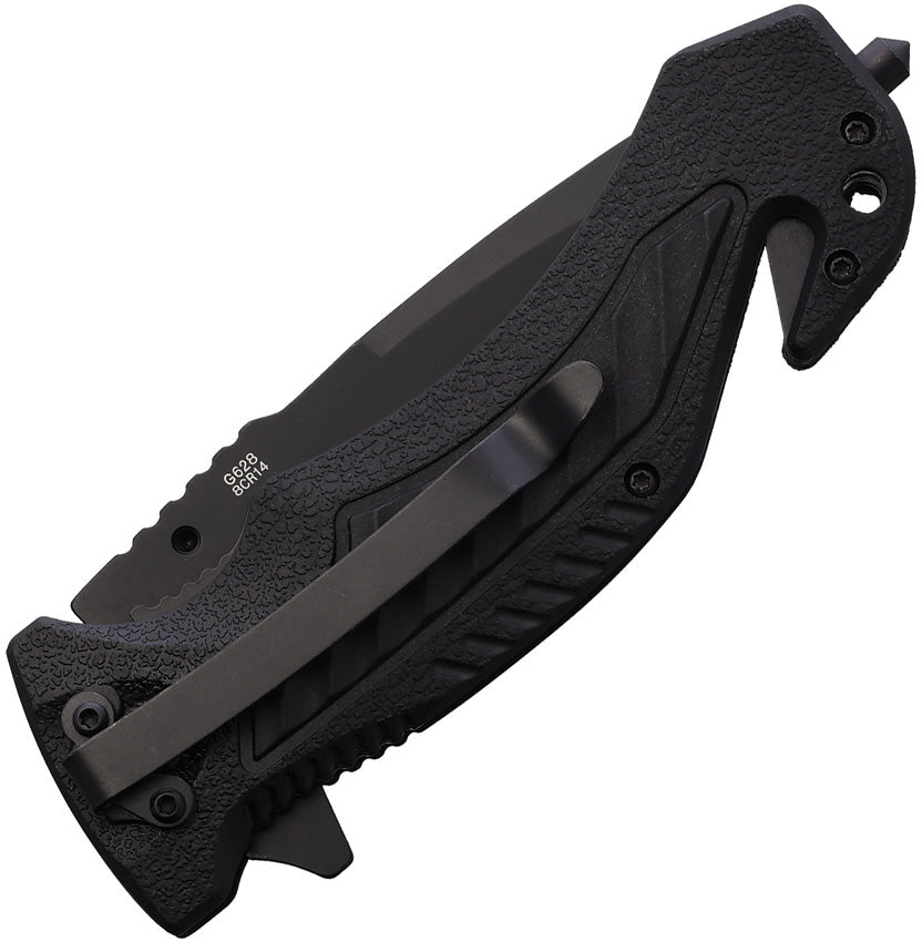 4.75" (12.07cm) closed. 3.5" (8.89cm) black finish 440 stainless drop point blade. Black polypropylene handle with Red aluminum onlay. Belt/cord cutter. Glass breaker. Extended tang. Pocket clip. Thumb stud. Lanyard hole. Boxed.