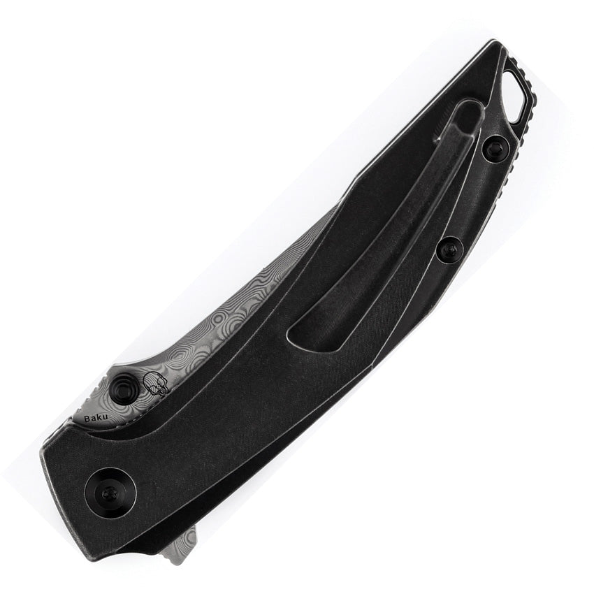 4.13" (10.49cm) closed. 3.25" (8.26cm) Damascus steel blade. Black stonewash finish titanium handle. Extended tang. Lanyard hole. Pocket clip. Thumb stud. Black nylon pouch. Boxed.