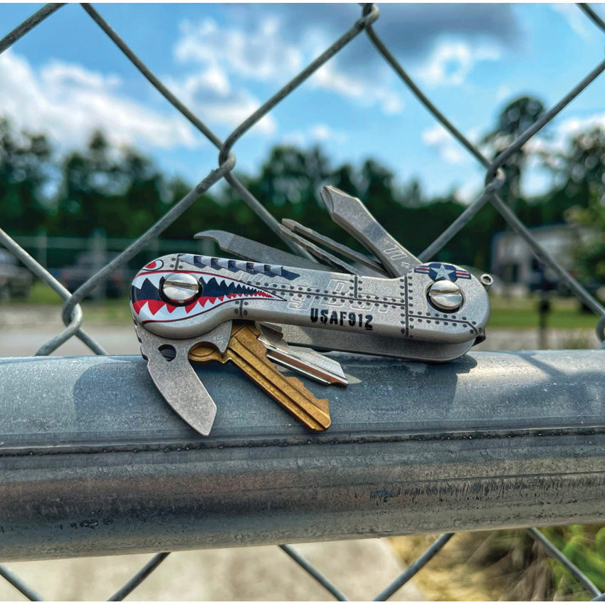 3.5" overall. Aluminum construction with bomber UV coating. Tools include: Pocket clip and Key fob. Screws included (to hold 4, 8, or 12 keys). Load keys in preferred order. O-rings keep keys snug and allow for adjustment of tension. Washers between keys for easy deployment. Includes link for key fob. Holds up to 12 keys. Keys and accessories not included. Hang packaged.