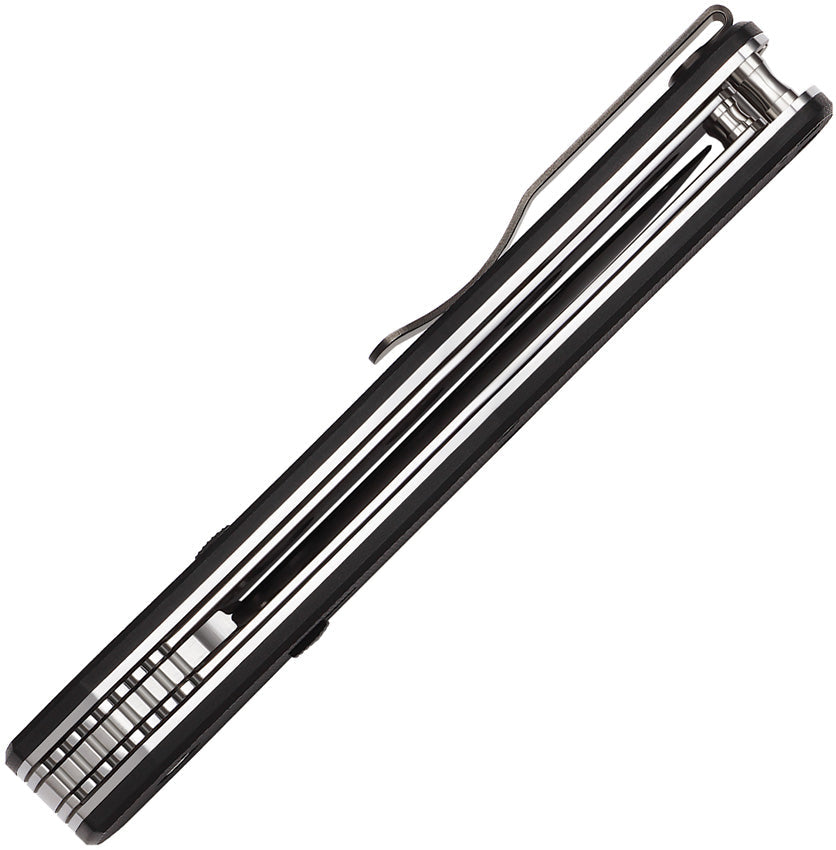 5" (12.7cm) closed. 3.25" (8.26cm) satin finish CPM S30V stainless blade. Black G10 handle. Patented mechanism consists of an outer handle, an inner handle, and a full-flat-ground CPM S30V stainless steel blade, all joined by a single pivot pin. Rotating the inner handle 360 degrees reveals the blade and locks it securely in the open position. An ambidextrous sliding latch mechanism reinforces the blade lock when open and also secures the blade and handles in the closed position for safe carry. Boxed.