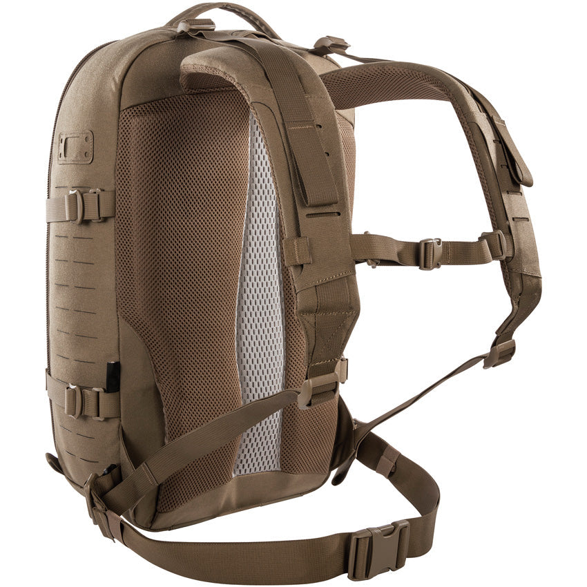 Dimensions: 20.5" x 11.88" x 5.5". 28 liter capacity. Padded back system with a height-adjustable chest belt. Removable webbing hip belt. Two removable, fully wraparound compression straps. Extra-durable handle. Hydration system compatible. Side attachment option through bungee cord. Flat mesh pockets. Front pocket with zipper. Detachable rear panel with aluminium frame (can be shaped individually). YKK zippers. 700D Cordura and T-Square Rip FD construction. Color: Coyote Brown.