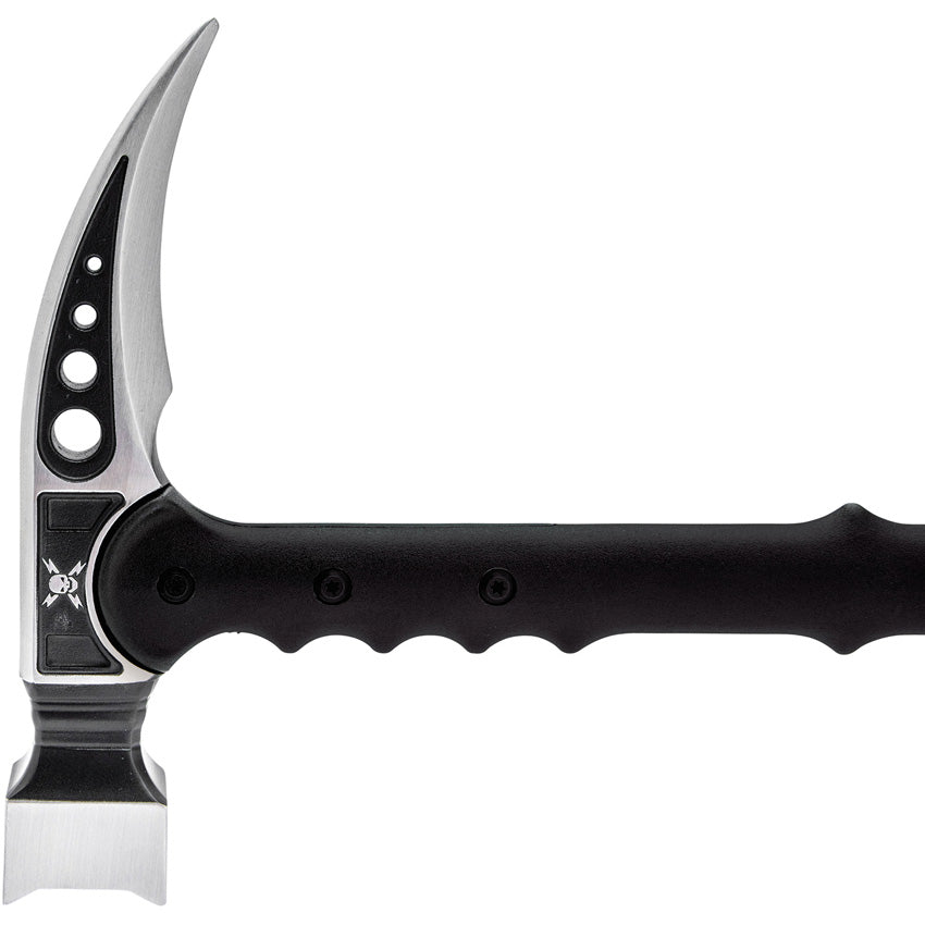 37.38" overall. Black oxide and satin coated stainless head with curved back spike and stout hammer head. Black fiberglass handle. Rubber foot on shaft allows for use as a staff. Boxed.