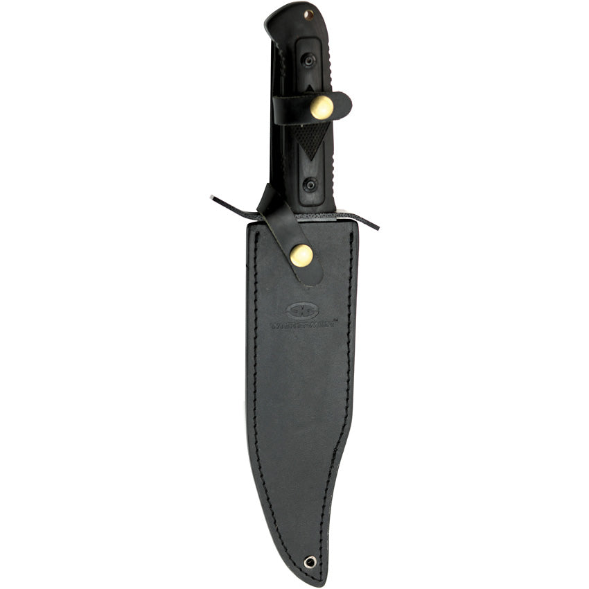 14.5" (36.83cm) overall. 9" (22.86cm) black matte finish 440C stainless bowie blade. Black pakkawood handle. Steel guard. Lanyard hole. Black leather belt sheath. Boxed.