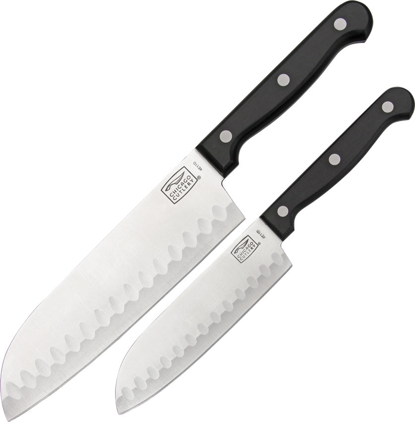 High carbon stainless blade. Black polymer handle. Full tang. Includes a 12" overall Santoku with 7" blade and a 9.25" overall Partoku with a 5" blade. Knives feature Taper Grind edge that provides optimum sharpness. Each knife comes in a clear reusable protector for convenient knife storage at home. Hang packaged.