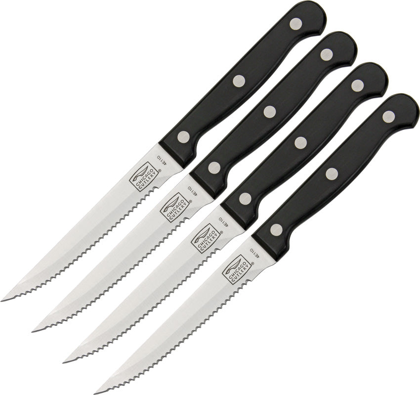 High carbon stainless blade. Black polymer handle. Full tang. Includes four 8.63" overall steak knives with 4.5" serrated blades. Hang packaged.