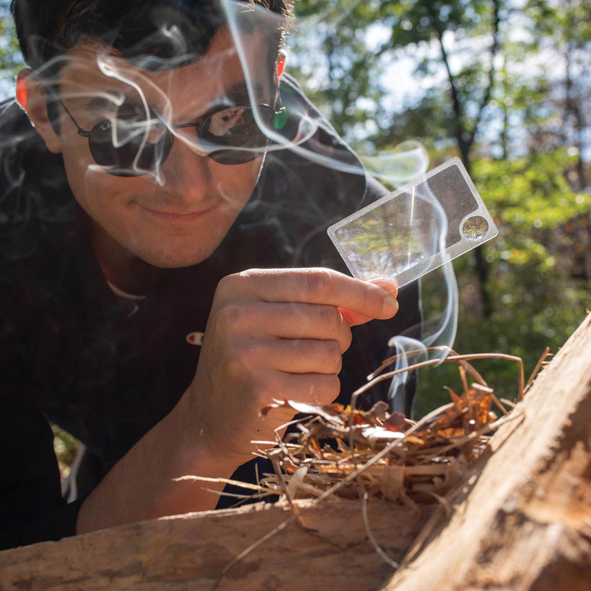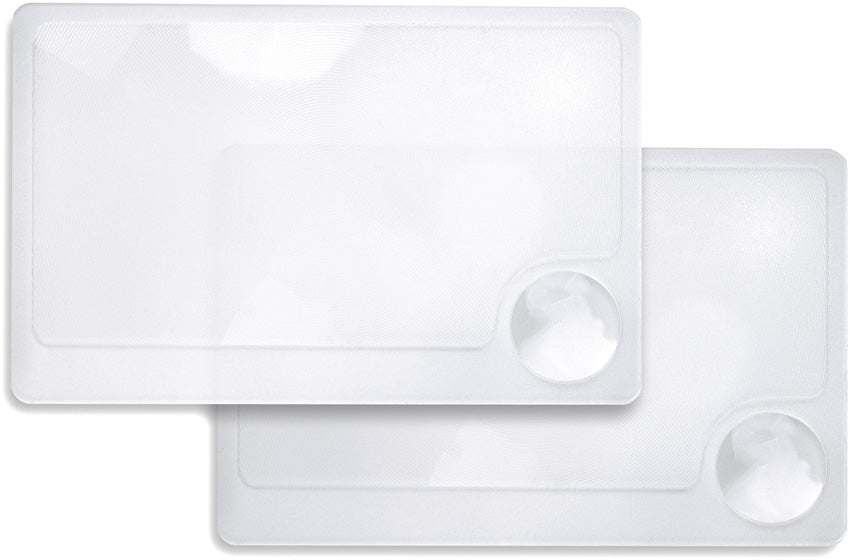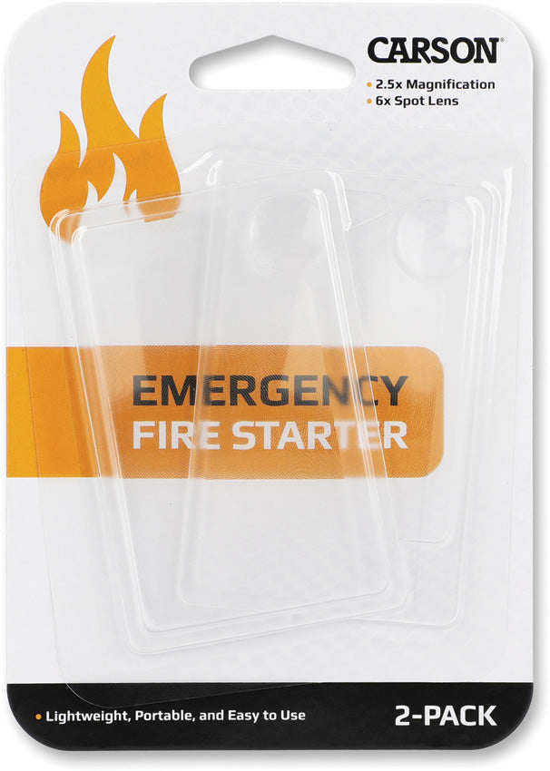 Pack of two. 2.5x magnification. 6x spot lens. Emergency fire starter. Wallet-sized. Hang packaged.