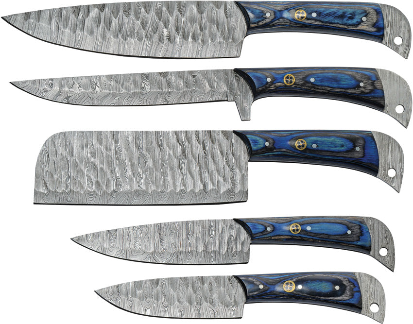Damascus steel blade. Blue and black pakkawood handle. Full tang. Includes: 10.5" overall cleaver; 11.5" overall Chef's; 11.5" overall fillet; 9.75" overall utility; 8" overall paring; Knife roll. Boxed.