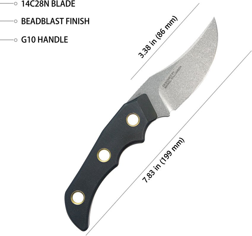 7.88" (20.02cm) overall. 3.38" (8.59cm) stonewash finish 14C28N Sandvik stainless clip point blade. Black G10 handle. Full tang. Lanyard hole. Black Kydex belt sheath. Boxed.
