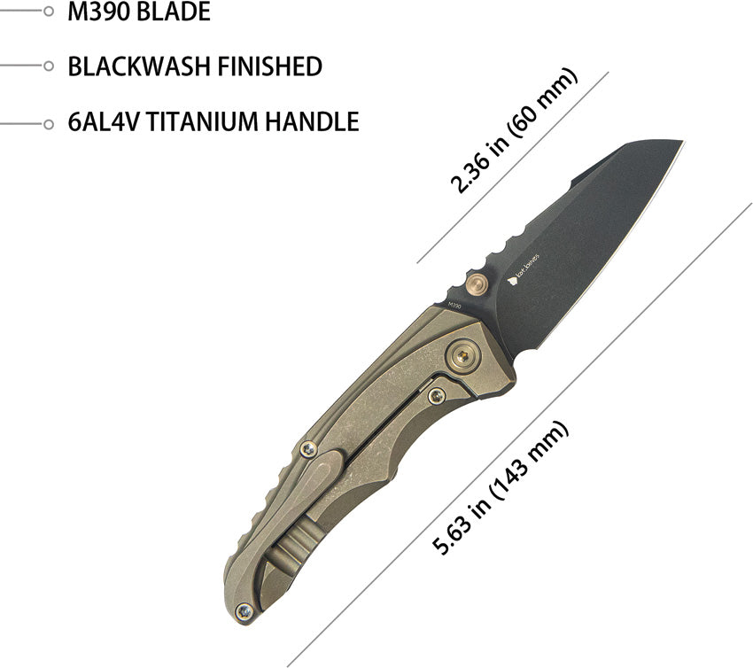 3.25" (8.26cm) closed. 2.38" (6.05cm) black stonewash finish Bohler M390 stainless sheepsfoot blade. Bronze stonewash finish titanium handle. Thumb stud. Pocket clip. Boxed.