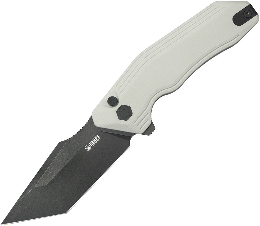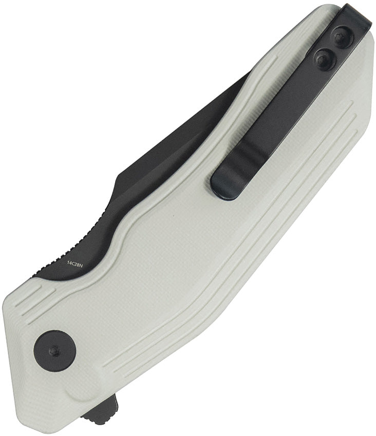 4.88" (12.4cm) closed. 3.25" (8.26cm) black stonewash finish 14C28N Sandvik stainless tanto blade. White G10 handle. Extended tang. Pocket clip. Boxed.