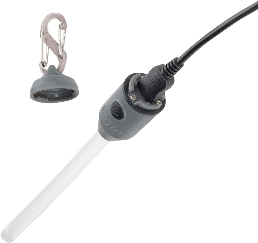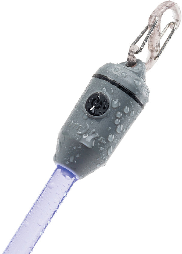 7.5" overall. Five modes (plus lockout): Disc-O, green, blue, red, flashing red. Waterproof (submersible in 1m of water for up to 30 min). Push button on/off plus select color. Recharges in approximately 1.25 hours using micro USB cable (not included). Unscrew detachable top with included S-Biner to access charging port. Entire glow stick illuminates red when charging, turns off when fully charged. Runs for up to 8.5 hours on a single charge. Hang packaged.