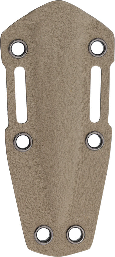 7.25" (18.42cm) overall. 3.25" (8.26cm) coyote tan Cerakote finish double edge K110 tool steel dagger blade. One-piece construction. Finger ring. Black Kydex belt sheath. Boxed.