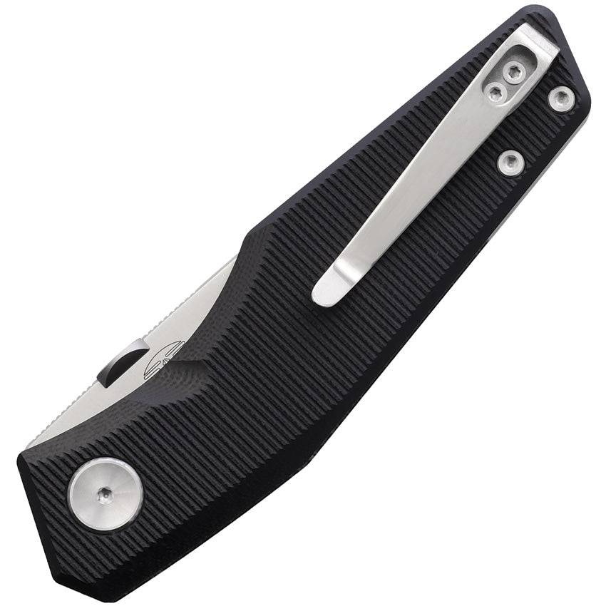 4.63" (11.76cm) closed. 3.38" (8.59cm) satin finish Nitro V steel blade. Black G10 handle. Thumb disk. Pocket clip. Boxed.