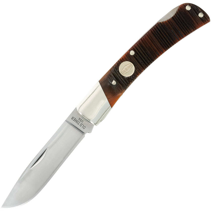 Old Timer. 3.75" (9.53cm) closed. Mirror finish 1095HC steel skinner blade. Brown sawcut bone handle. Nickel silver bolster(s). Inlay shield.