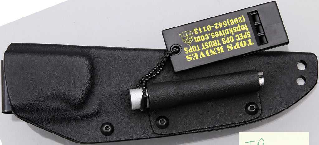 Brothers of Bushcraft. 9 3/4" overall. 4 5/8" 1095 high carbon steel blade with partial black traction coating and a modified Scandinavian Grind which is very effective for carving, skinning and other general woods work. Thumb ridge. Hardened to 56-58 HRC. Full tang. Black and green G-10 handles feature a divot that can be used as the socket for the fire bow drill method. Finger guard. Lanyard hole. Pommel features a scraper specially designed for striking Ferro rods in a safe and efficient manner. Black molded Kydex belt sheath with metal clip, a built-in Ferro-rod attachment point. Includes 3 1/8" overall fire starter and black composition survival whistle. Certificate of Authenticity. Made in U.S.A.