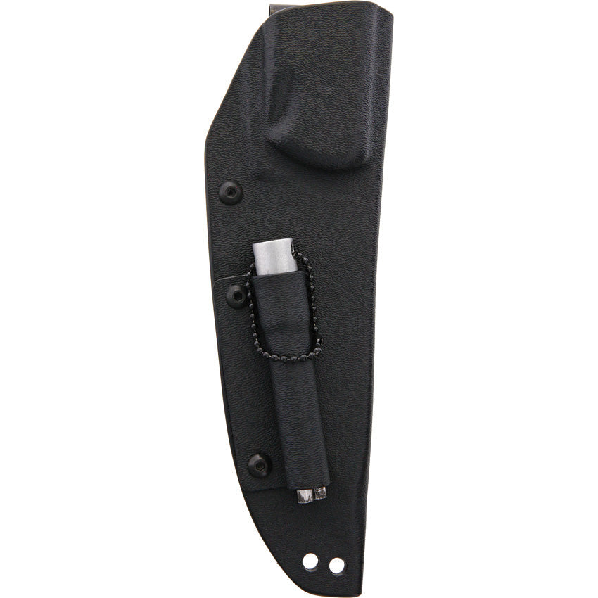 9 3/4" overall. 4 1/2" 1095 high carbon steel drop point blade with partial tumble finish, modified Scandinavian grind, and thumb ridge. Full tang. Gray canvas micarta handles with lanyard hole. Handle features a divot that can be used as a socket for the fire bow drill method. Pommel features a scraper specially designed for striking Ferro rods in a safe and efficient manner. Black molded Kydex belt sheath with built-in ferro rod attachment point. Comes with fire starter and survival whistle.