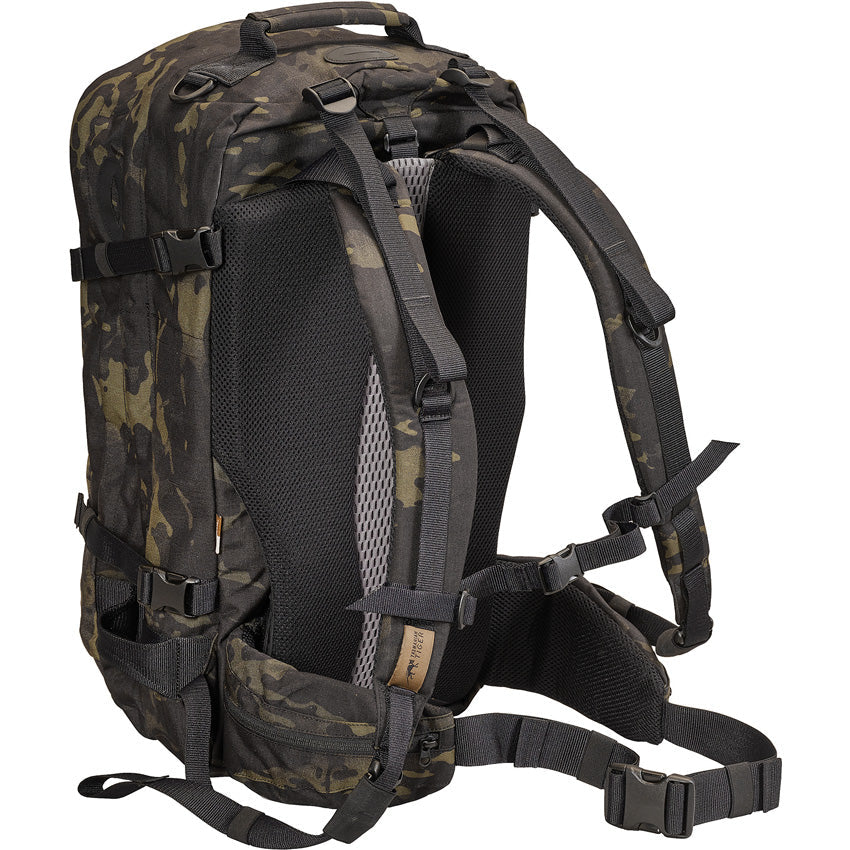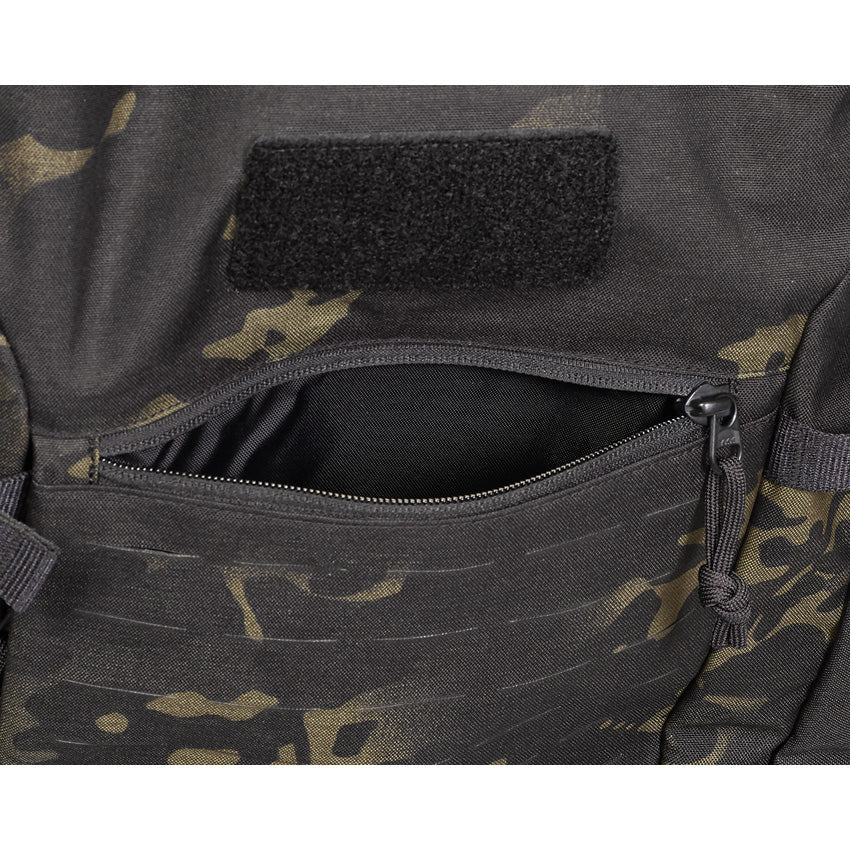 Dimensions: 22" x 13" x 7". 37 liter capacity. Reinforced handle. Main pack sack equipped with emergency carry handle. Hydration system compatible (not included). Two large main compartments. Integrated rain cover inside bottom compartment. Subdivided into seven separate pockets. Detachable rear panel with aluminum frame (can be shaped individually). Three hose or antenna outlets on the main and front compartments. YKK zippers. Color: Multi Cam Black. 700D Cordura construction. Bulk packed.