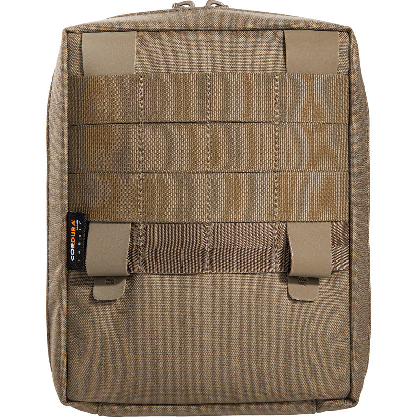 Dimensions: 7.8" x 6" x 2.3". Extra wide zippered opening. Flat mesh inside pocket that can be opened from two sides. Front compartment with zipper. Hook and loop inside patch and strip for name tag. Elastic loops. Strap system to hold additional equipment. MOLLE reverse system. Needs four MOLLE loops. 700D Cordura construction. Color: Coyote Brown. Bulk packed.
