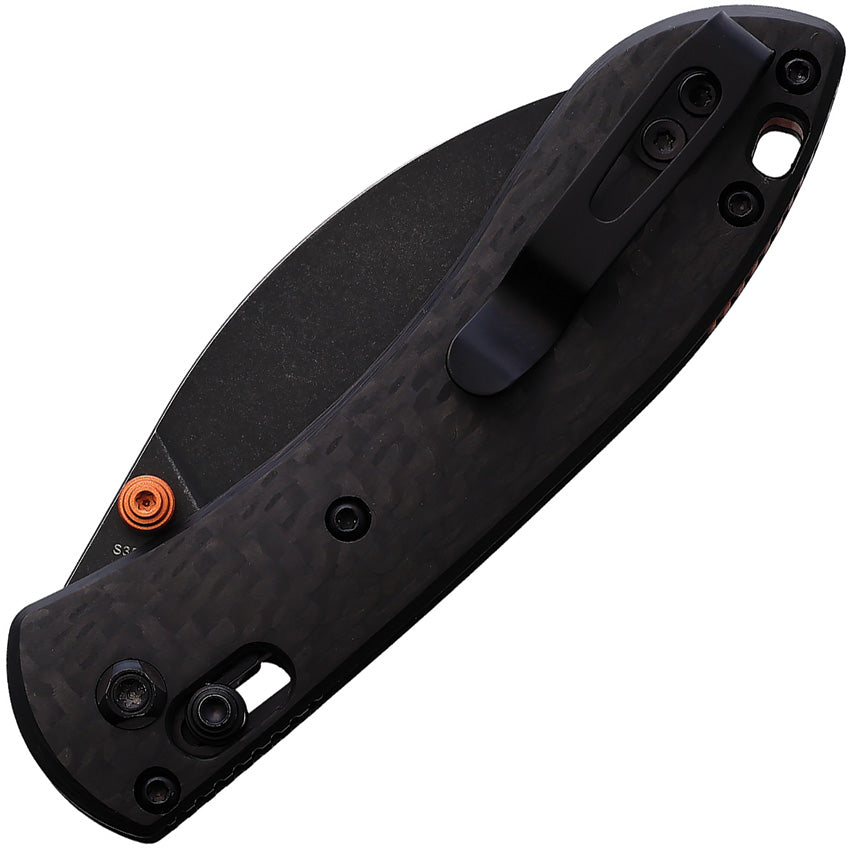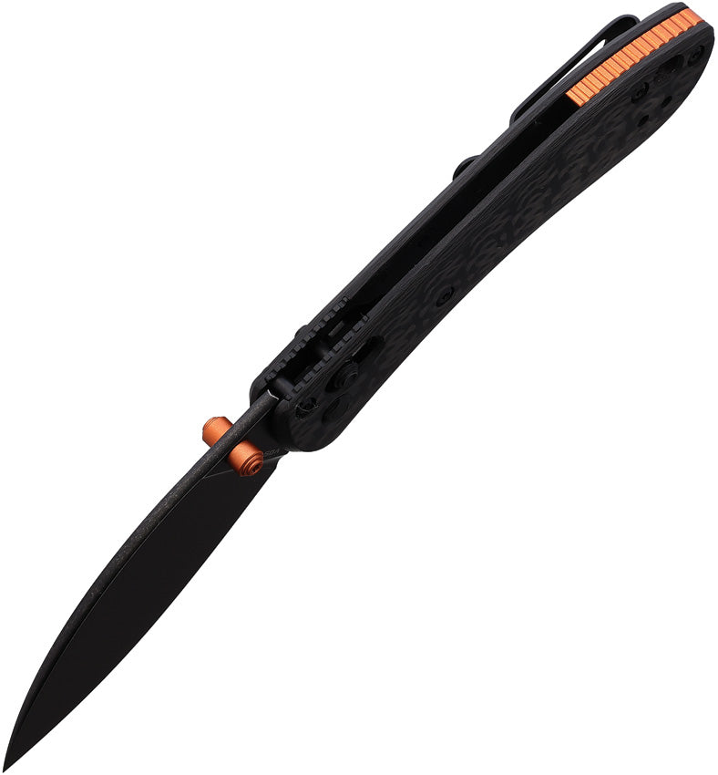 3.75" (9.53cm) closed. 2.63" (6.68cm) black stonewash finish S35VN stainless blade. Carbon fiber handle. Thumb stud. Lanyard hole. Pocket clip. Shilin cutter style blade. Orange accents. Black nylon zippered storage case. Boxed.