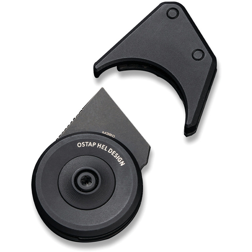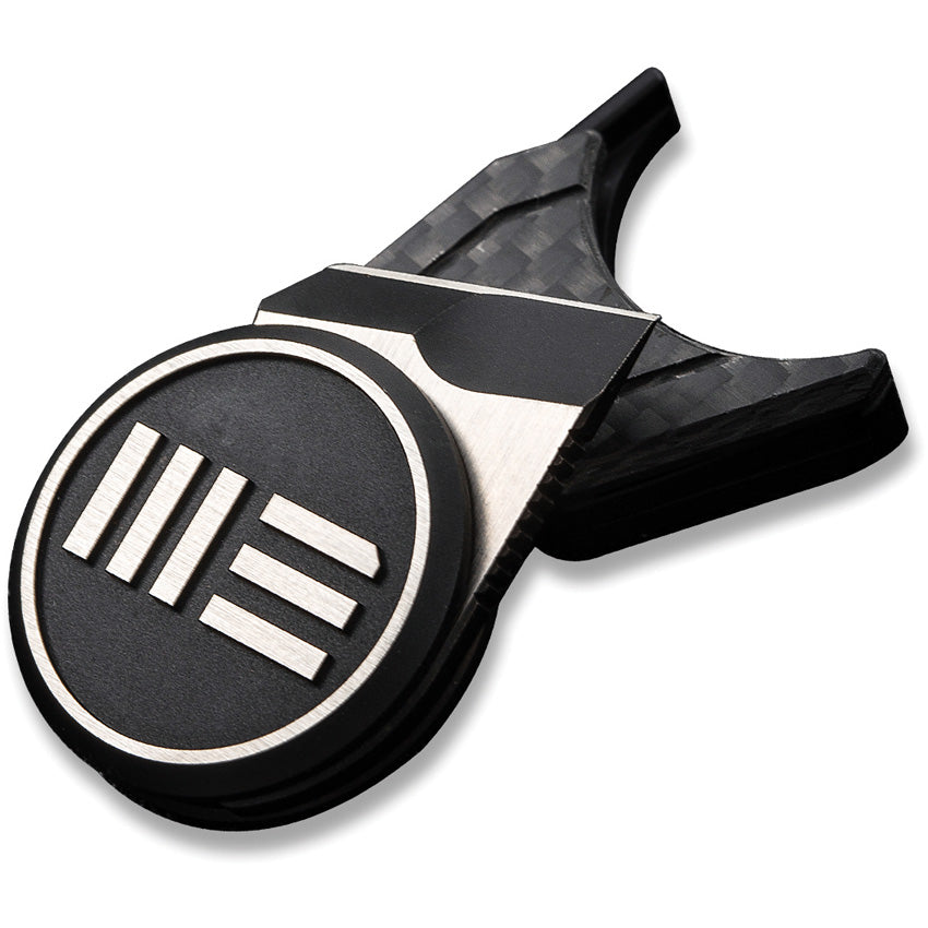 1.5" (3.81cm) overall. 0.25" (.64cm) black stonewash and satin finish Bohler M390 stainless blade. Black titanium handle. Lanyard hole. Blade cover with twill carbon fiber front and black titanium back. Silver WE logo on handle. Ball chain lanyard. Boxed.