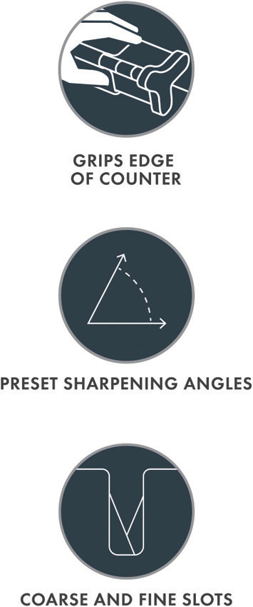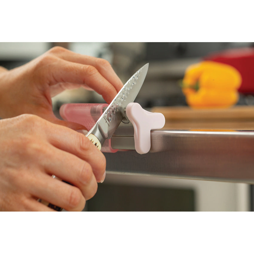 3,5" complessivi. Manico rosa. Fessure grossolane e fini con angoli di affilatura preimpostati. Afferra il bordo del bancone. Le fessure scorrono nel manico. Confezione in plastica.
