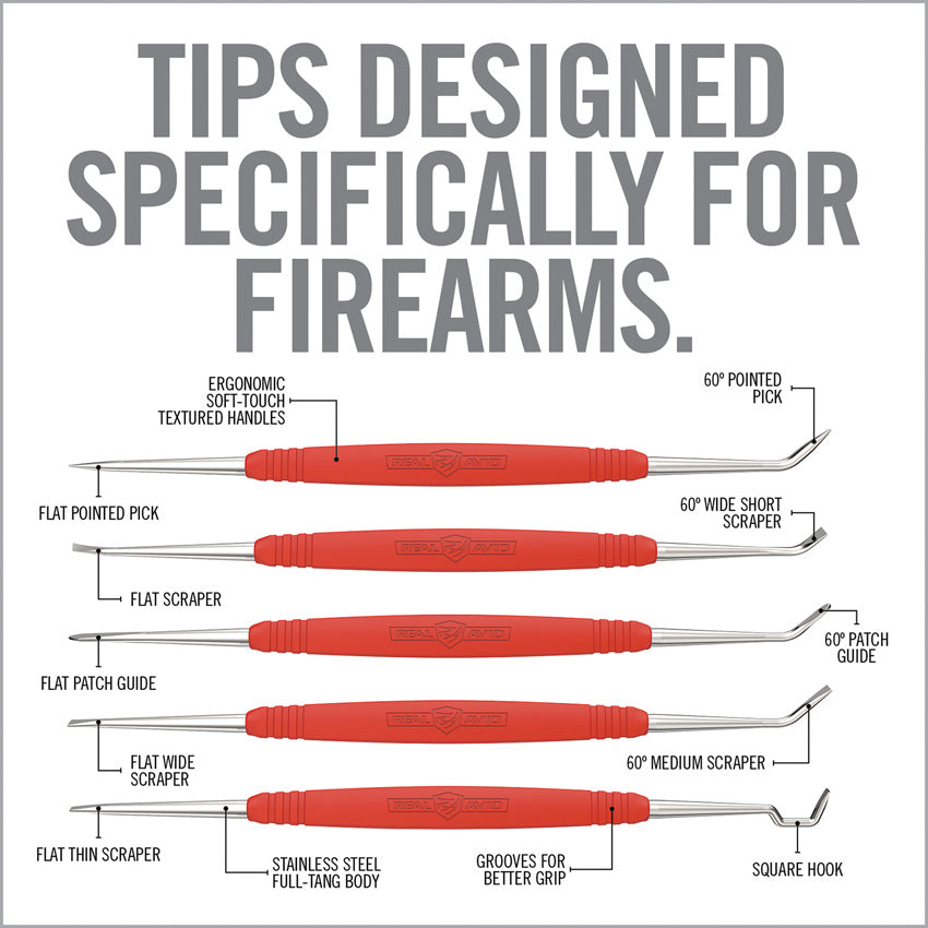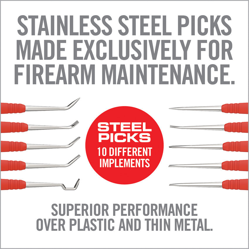 Includes: 60 degree pointed pick; flat pointed pick; 60 degree wide short scraper; Flat scraper; 60 degree patch guide; Flat patch guide; 60 degree medium scraper; Flat wide scraper; Square hook; Flat thin scraper. Full tang stainless body with Accu-Grip handles. Five different picks with dual ends for ten different implements. Use on firearm bolts, slides, and suppressors. Clam packed.