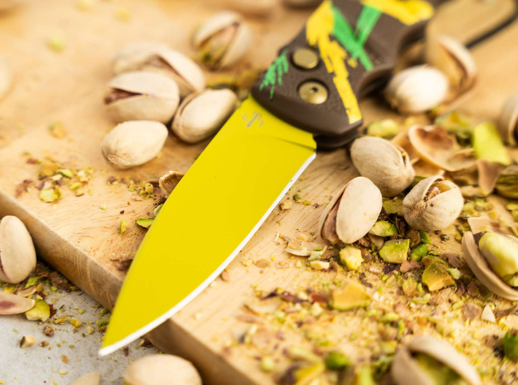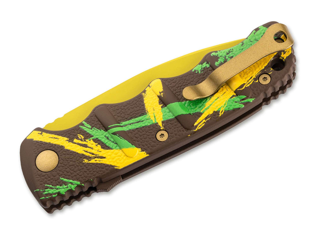 The Boker Plus AKS-74 from the Kalashnikov series is certainly one of the most popular Boker Plus models and has been produced in numerous different versions in recent years. In this exquisite Dubai Chocolate Edition, the aluminium handle has a greenish brown and yellow colour scheme in reference to the coveted sweet, while the raised textured bolsters offer a secure grip in any situation despite their melt-in-the-mouth character. The yellow-coated blade is made from stainless D2 and can be secured with a slide lock on the top of the handle in addition to the push button. Supplied with a lanyard hole and a practical clip (tip-up/r).