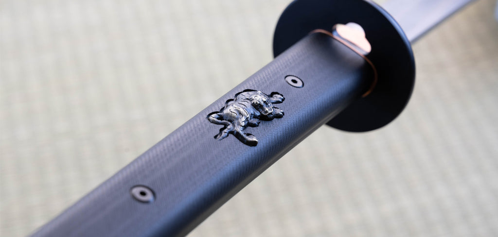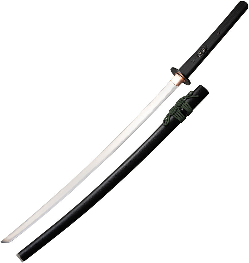 39.5" (100.33cm) overall. 27" (68.58cm) 5160 carbon steel blade. Black G10 handle. Hamon line with a copper habaki and seppa. Silver menuki on the tsuka are shi shi (lion dogs) which are embedded in the handle. Black polymer scabbard. Boxed.