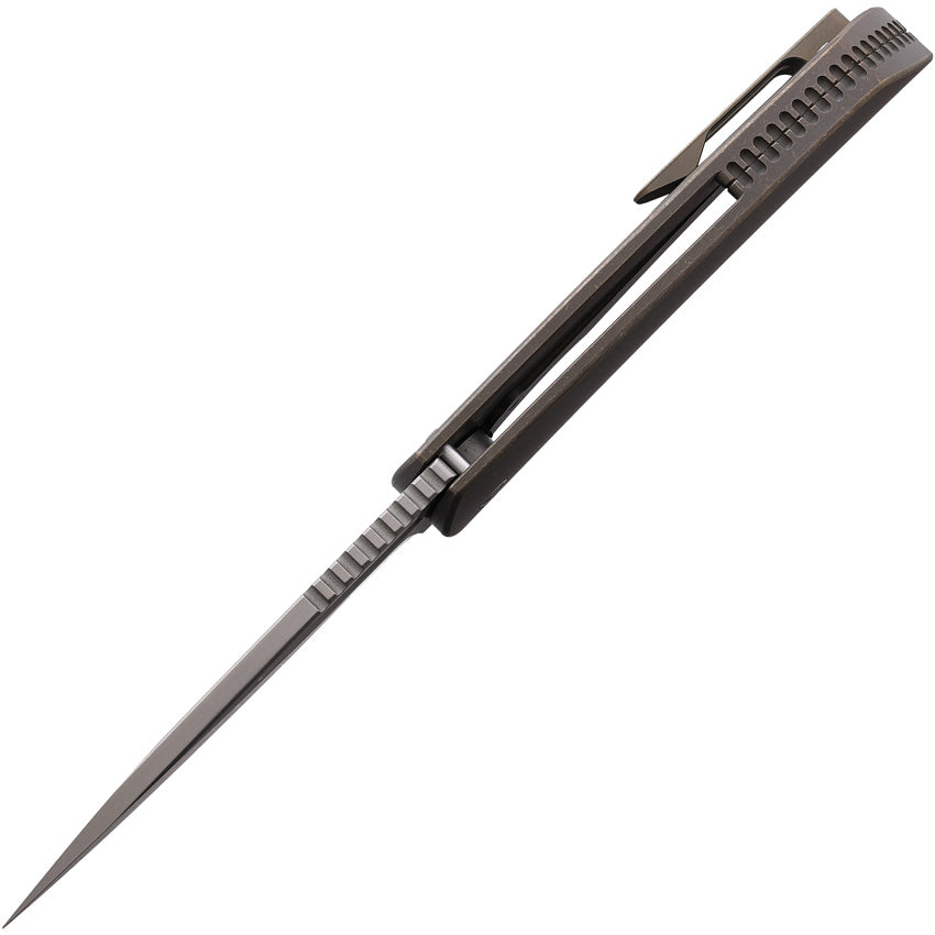 4.5" (11.43cm) closed. 3.5" (8.89cm) stonewash finish CPM-20CV stainless blade. Bronze stonewash finish titanium handle. Thumb pull. Extended tang. Pocket clip. Zippered storage case.