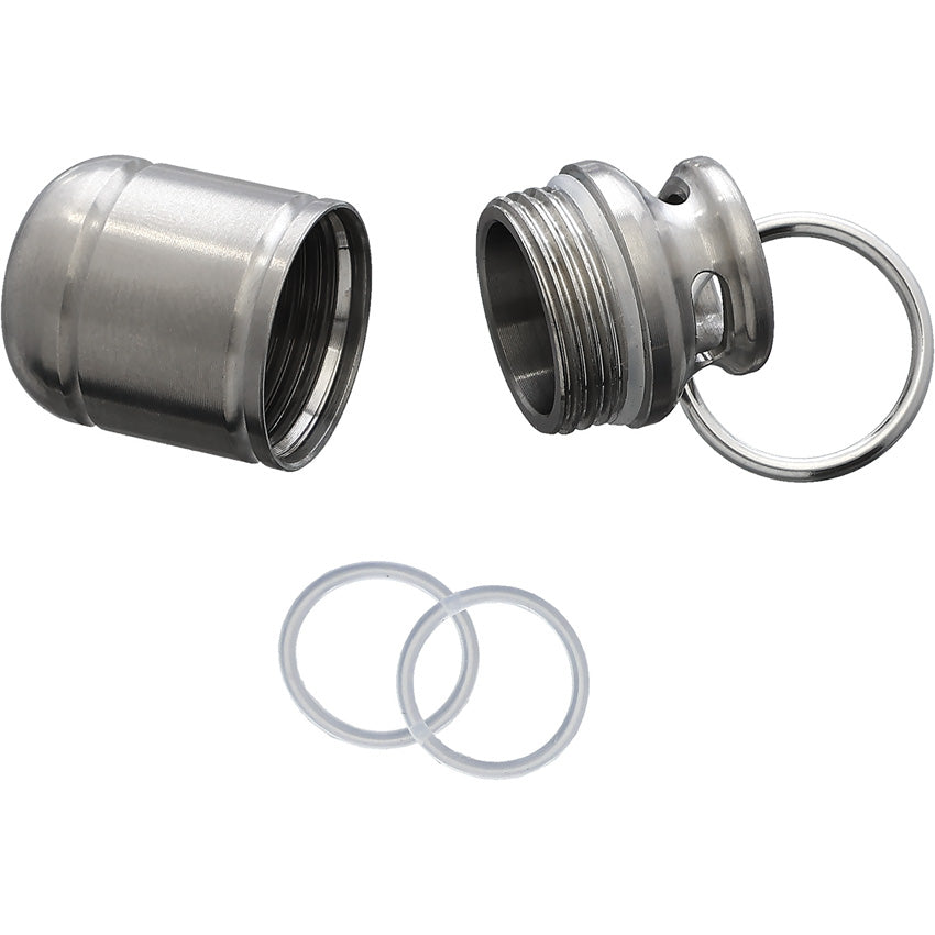 Dimensioni: 2,5 x 1,6 x 1,5 cm. Struttura in titanio di grado TA2 con portachiavi in ​​acciaio. Include O-ring extra. Confezione sfusa.