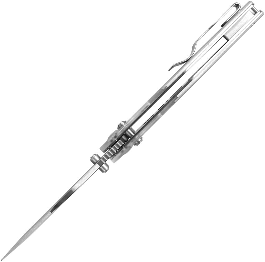 4.38" (11.13cm) closed. 3.25" (8.26cm) satin finish Nitro V steel clip point blade. Gray aluminum handle. Thumb stud. Pocket clip. Clear acrylic bolster. Boxed.