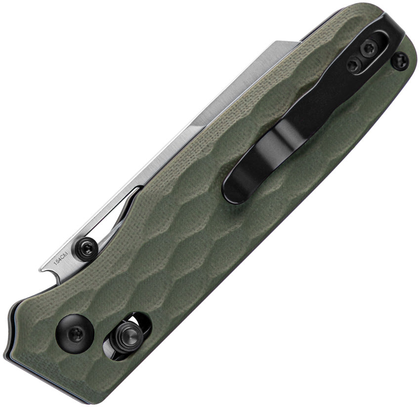 4" (10.16cm) closed. 3" (7.62cm) satin finish 154CM stainless blade. OD green sculpted G10 handle. Thumb stud. Pocket clip. Boxed.