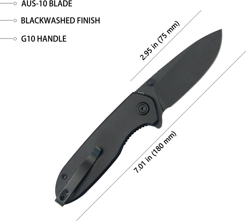 4" (10.16cm) closed. 3" (7.62cm) black stonewash finish AUS-10A stainless blade. Black G10 handle. Extended tang. Thumb stud. Pocket clip. Boxed.
