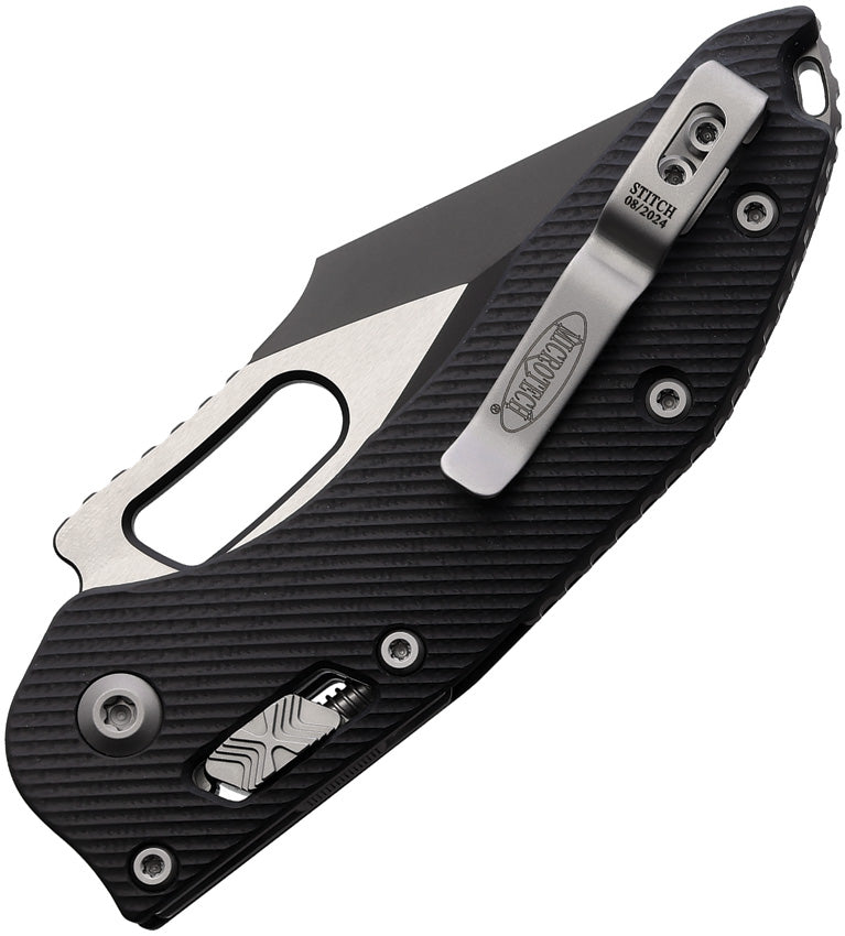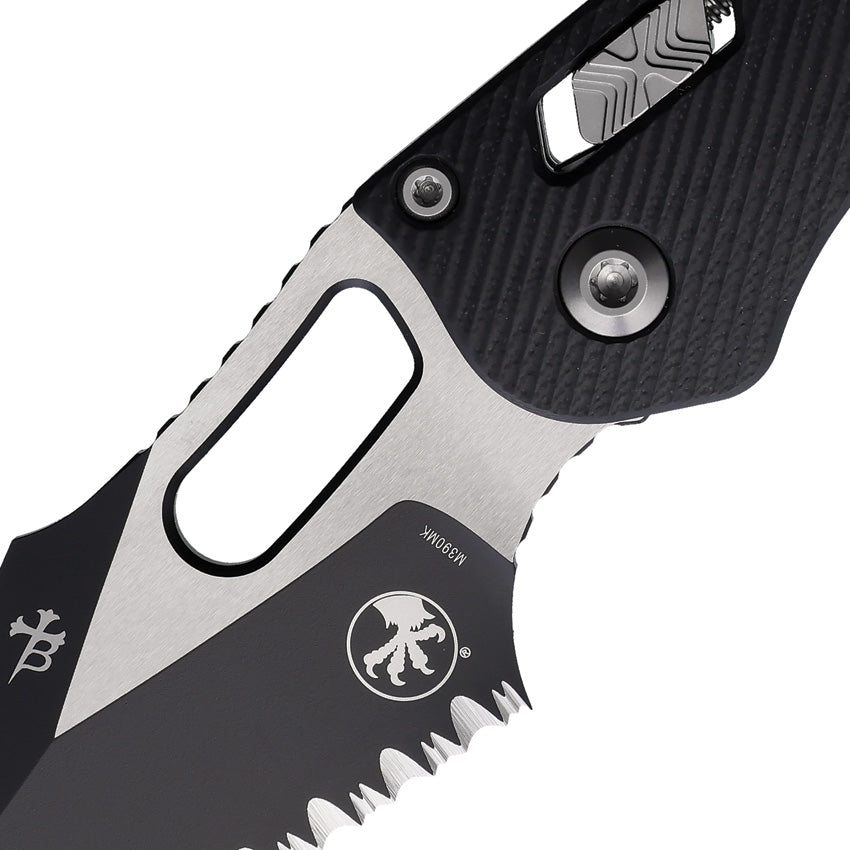 5" (12.7cm) closed. 3.75" (9.53cm) two-tone finish partially serrated Bohler M390MK stainless blade. Black fluted G10 handle. Thumb pull. Lanyard hole. Pocket clip. Microtech item #169RL-2FLTBK. Boxed.