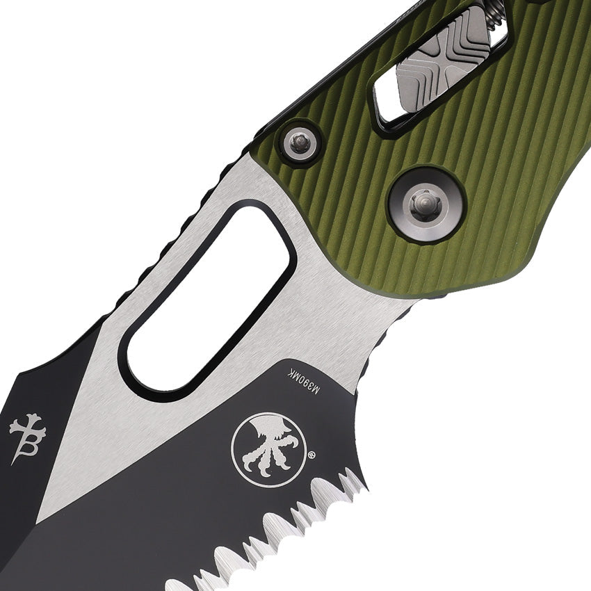 5" (12.7cm) closed. 3.75" (9.53cm) two-tone finish partially serrated Bohler M390MK stainless blade. OD green fluted aluminum handle. Thumb pull. Lanyard hole. Pocket clip. Microtech item #169RL-2FLOD. Boxed.