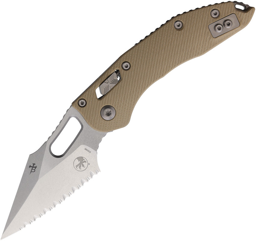 5" (12.7cm) closed. 3.75" (9.53cm) stonewash finish serrated Bohler M390MK stainless blade. Tan fluted G10 handle. Thumb pull. Lanyard hole. Pocket clip. Microtech item #169RL-12FLGTTA Boxed.