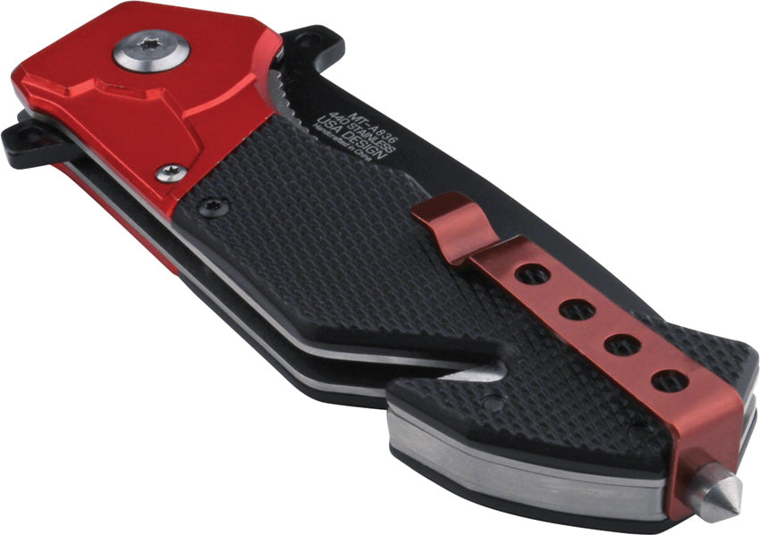 Assisted opening. 4.75" closed. 3.25" black finish partially serrated 440 stainless tanto blade. Red aluminum handle. Extended tang. Belt/cord cutter. Glass breaker. Pocket clip. Handles with checkered black synthetic trim and Fire Department inlay shield.