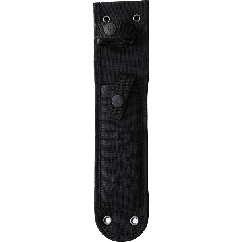 7.88" (20.02cm) overall. 3.5" (8.89cm) black phosphate coated carbon steel blade. Blue-Gray micarta handle. Full, extended tang. Lanyard hole. Black nylon belt sheath. Boxed.