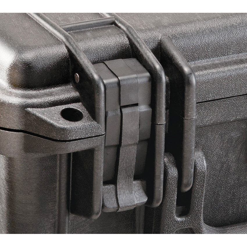 Dimensions: 9.44" x 7.8" x 4.29". Interior dimensions: 8.49" x 5.99" x 3.75". Color: Black. Water tight, crush proof, and dust proof. Automatic purge valve: a bi-directional membrane that equalizes pressure but keeps moisture out. Easy open double throw latch. O-ring seal. Open cell core with solid wall design. Pick N Pluck with convoluted lid foam. Stainless hardware. Polypropylene construction. Boxed.