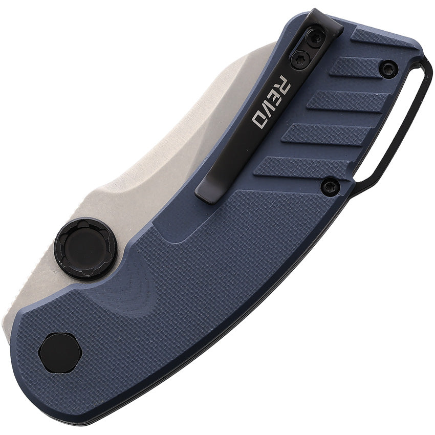Assisted opening. 4.25" (10.8cm) closed. 3" (7.62cm) stonewash finish 9Cr18MoV stainless blade. Blue-Gray G10 handle. Lanyard hole. Pocket clip. Zippered storage case.