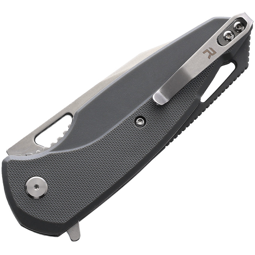 Assisted opening. 4.25" (10.8cm) closed. 3" (7.62cm) stonewash finish 8Cr14MoV stainless clip point blade. Gray G10 handle. Extended tang. Lanyard hole. Pocket clip. Thumb pull. Boxed.