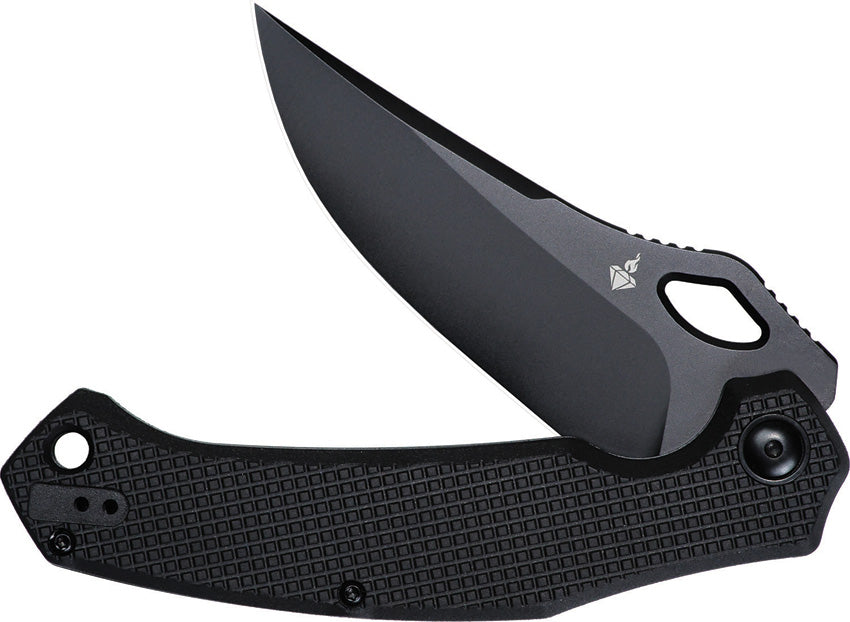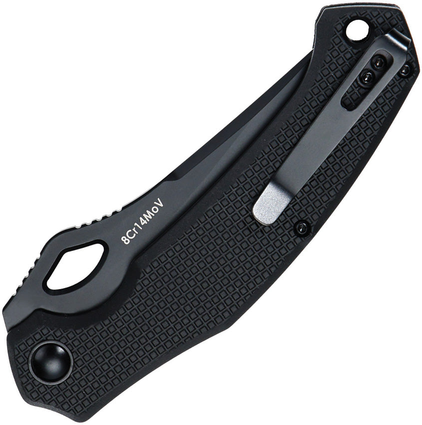 4.5" (11.43cm) closed. 3.38" (8.59cm) black PVD coated 8Cr14MoV stainless clip point blade. Black FRN handle. Thumb pull. Lanyard hole. Pocket clip. Zippered storage case.